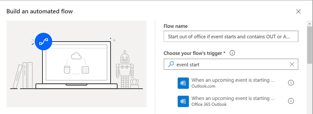 I created a new Flow that I called “Start out of office if event starts and contains OUT or AWAY”, which will trigger just before an event is about to start. In that case, I usually have my “away event” at 8am or set for the whole day (00:00).