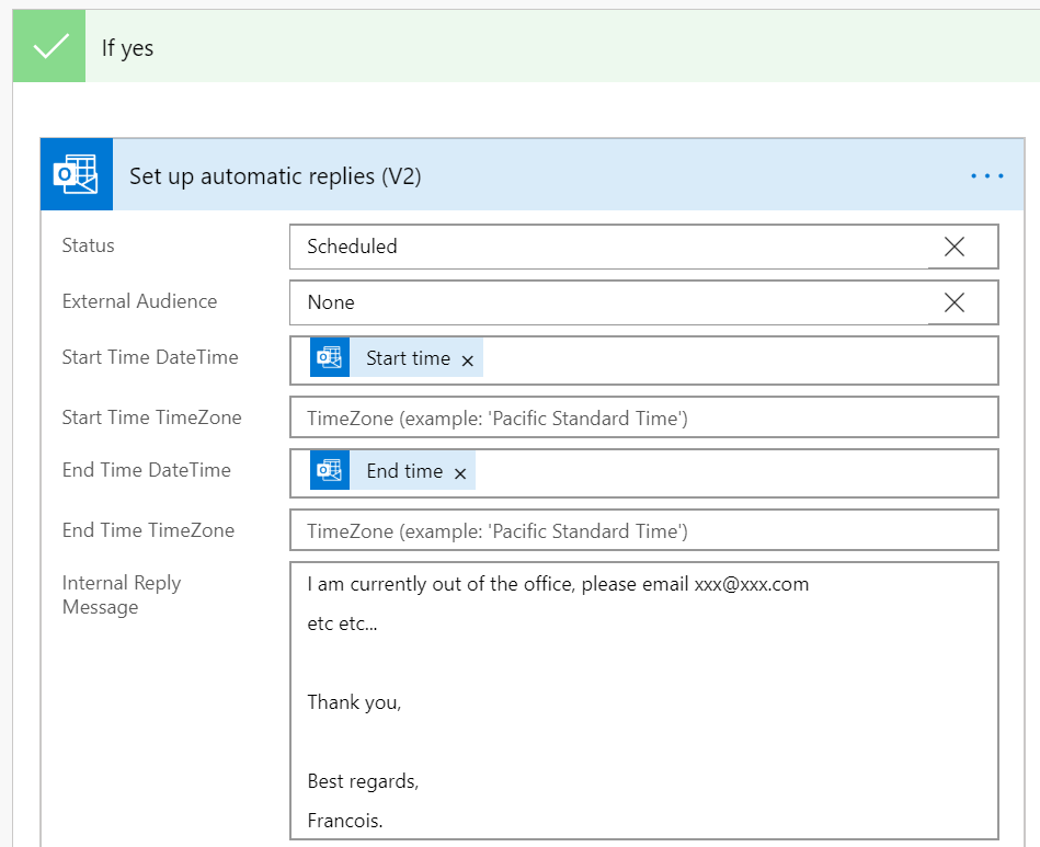 Note that there is no step to disabling the OOO since it is done while we enable it (End Time). There is no action required in the”If no” case either since the Flow will just go to the end and stop.